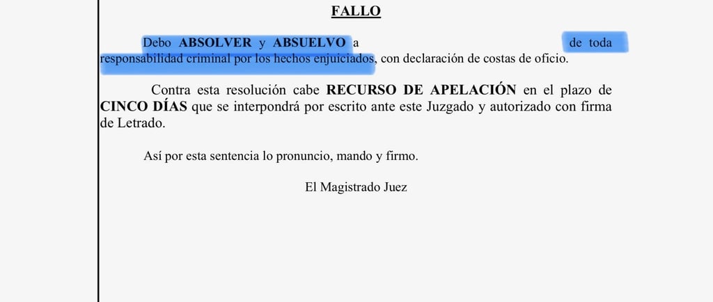 El Juzgado de lo Penal valoró todos los elementos aportados por la defensa y concluyó que no existía prueba alguna de que nuestro cliente hubiera fingido la lesión ni que tuviera intención de engañar al seguro.