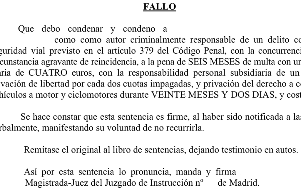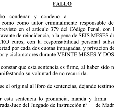 Además de la correspondiente multa y la retirada del permiso de conducir, se consiguió que la condena no implicara una privación efectiva de libertad.